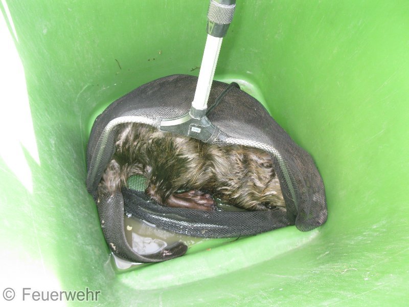 Beim Auspumpen eines Schwimmteiches konnte ein im Teich versteckter Biber aufgrund des niedrigen Wasserstandes nicht mehr aus eigener Kraft herausklettern.