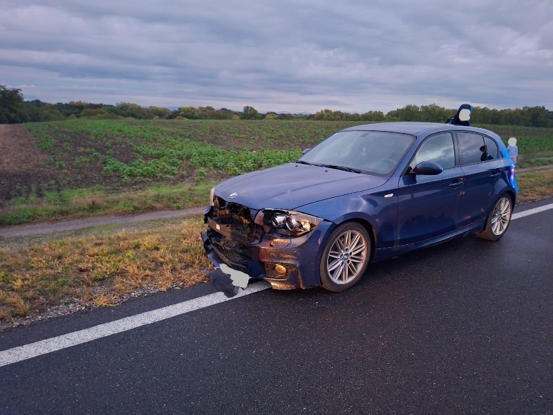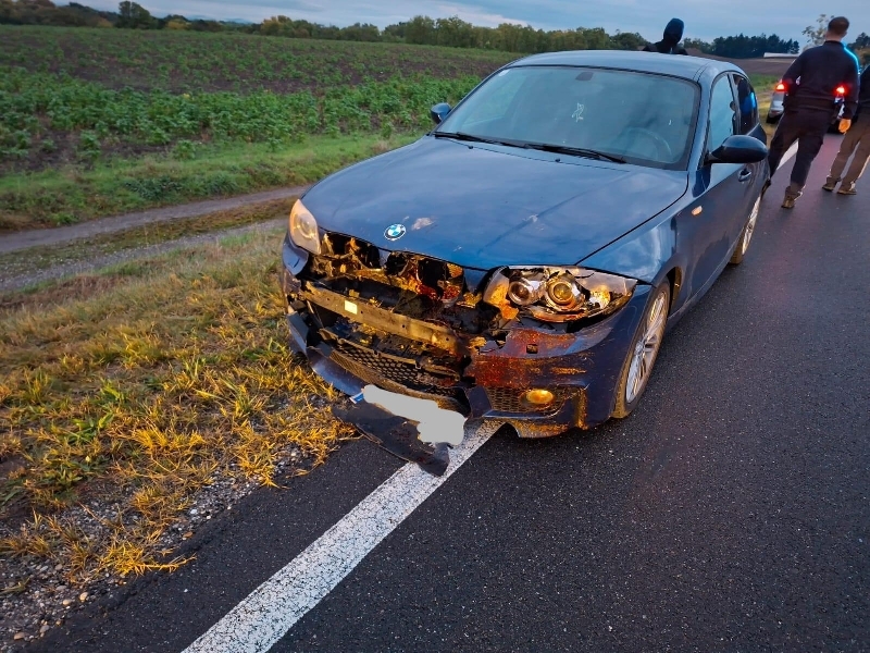 PKW stand in Fahrtrichtung Dürnkrut bei km 39,4 auf der B49 am rechten Fahrbahnrand. Durch Berührung mit einem Reh wurde die Front des PKW total beschädigt und es rauchte aus dem Motorraum.