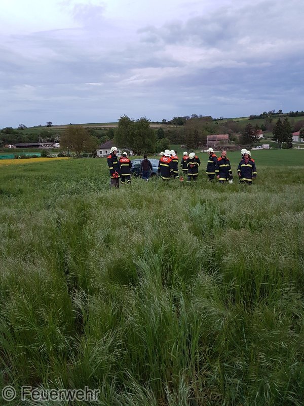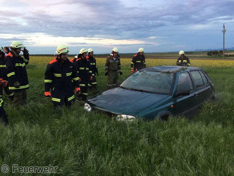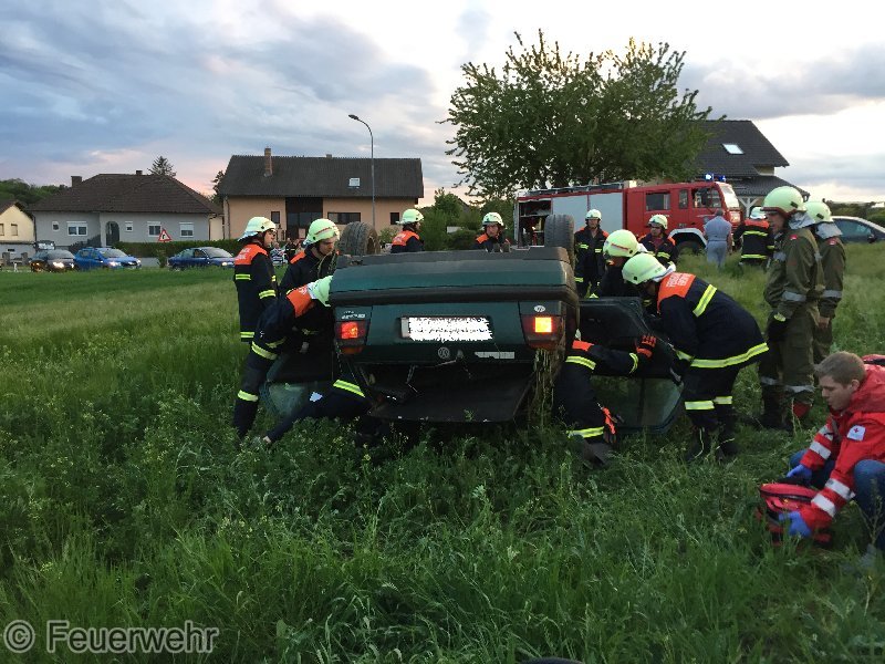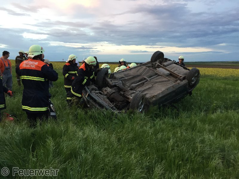 Sanitäter vor Ort, verunfallte Person war bereits aus dem Fahrzeug. PKW liegt am Dach im Feld in Fahrtrichtung Ebenthal